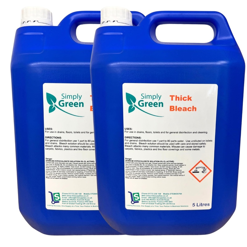 Introducing Simply Green’s 5-Litre Thick Bleach, your ultimate cleaning companion for a fresh and hygienic home. For use in drains, floors, toilets and for general disinfection and cleaning. Powerful Cleaning: Simply Green’s Thick Bleach is designed to tackle tough stains, germs, and odours, leaving surfaces gleaming and sanitized. The thick consistency clings to surfaces for extended contact time, ensuring a thorough and deep clean. Our large container provides you with an ample supply, ensuring you get the best value for your money. Always follow label instructions and take appropriate safety precautions when using this product. Keep out of reach of children. In case of contact with eyes or skin, rinse thoroughly with water. INGREDIENTS BleachDilute the Thick Bleach according to the recommended ratio, based on your cleaning needs. Powerful Cleaning. Thick consistency. 2 x 5 Litre.