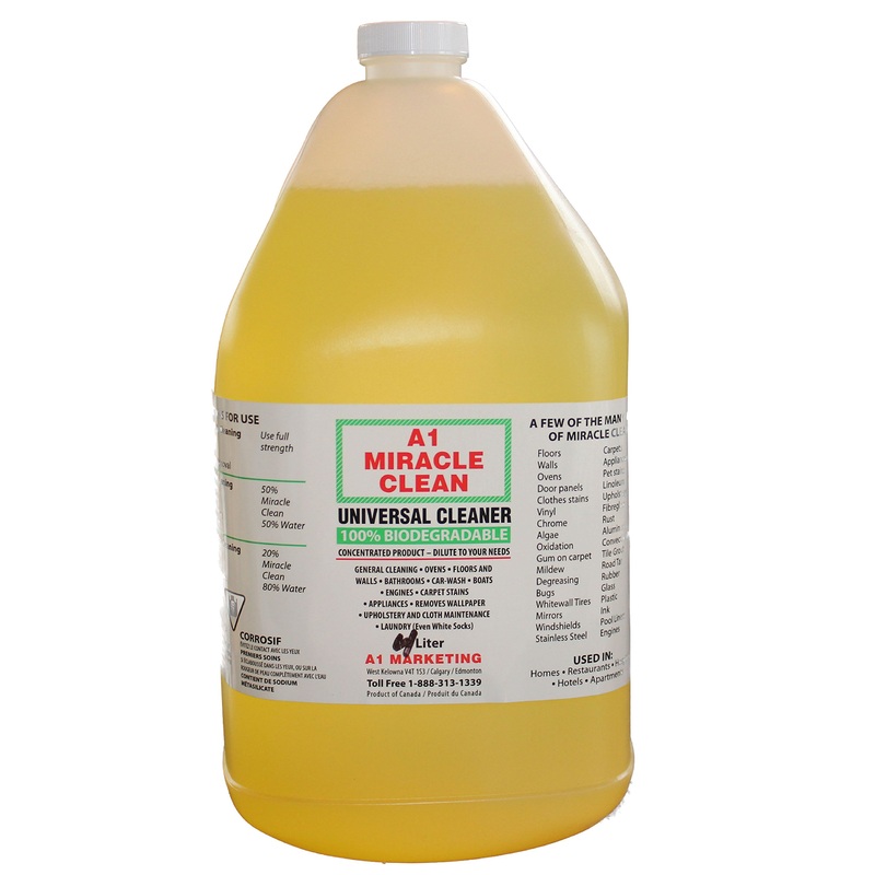 Get tough on grease and grime with our 100 biodegradable, environmentally friendly Miracle Clean. Thoroughly clean appliances, counter tops, floors, showers and tubs, and many more surfaces around your house.It’s hard to go wrong with Miracle Clean. It cuts through the most stubborn grease and grime, and it deodorizes, leaving no smeary residue.It isn’t just good, it’s a Miracle.Miracle Clean is concentrated so you control the strength for each cleaning job you have around the house, garage or cottage. You can dilute it to use as a spot remover in the laundry or for pet stains on most carpets (as with all cleaners you should test it on a non-visible area first). Why use a full strength cleaner on easy jobs or even worse, why use twice as much of a less powerful cleaner to get the job done.Dilute 80 Water on Walls, Glass and Counter Tops. Dilute 50 on Carpets, Laundry, Upholstery, Pet Stains. Use full strength on Engines, ovens and grease Removal.