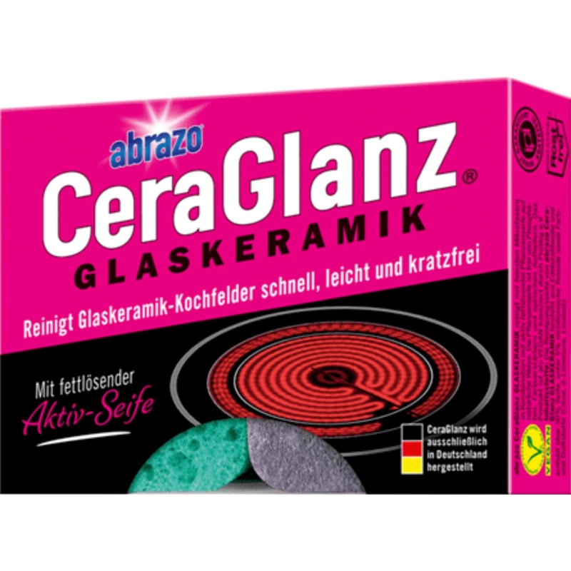 How to do it: Moisten the cleaning side of CeraGlanz GLASKERAMIK, clean and wipe the hob. Reusable. Do not rinse out CeraGlanz GLASKERAMIK, but let it dry with the foam. So it can be used multiple times. Manufacturer: OSCAR WEIL GmbH. Tramplerstr. 27 31, 77933 Lahr, Germany.Contents per pack: 2 pads. In 2013 abrazo was awarded as a top brand in the German food trade. Impeccable premium quality, the finest stainless steel wool ensure professional cleaning not only in the kitchen. A strong glass cleaning accessory made in Germany. Licensed as VEGAN – Made in Germany . In Germany, abrazo is synonymous with saponified cleaning pads made from steel wool. Tradition Quality Made in Germany since 1901. That is why abrazo has stood for powerful cleaning radiant cleanliness in the household for more than 100 years . How to do it: Moisten the cleaning side of CeraGlanz GLASKERAMIK, clean and wipe the hob. Reusable. Do not rinse out CeraGlanz GLASKERAMIK, but let it dry with the foam. So it can be used multiple times . Unsurpassed mode of action through the interaction of the finest stainless steel fibers in combination with degreg cleaning soap based on natural plant-based raw materials . A reliable inexpensive professional glass cleaner that works scratch-free against fats oils. Further applicability: shower, shower cubicle, window frame. Farewell scratch-prone hob scraper . Active foam dissolves all grease and dirt active fibers remove even burnt residues completely. The CeraGlanz cleaning sponge works quickly and is guaranteed scratch-free. A professional foam active soap cleaner for hygiene throughout the home . The first dual cleaner for all glass ceramic cooktops. Glass scraper glass cleaner in one. An effective cleaner for the stovetop hotplate made of glass ceramic. This means that your ceramic hob is guaranteed to be free of burnt-in dirt . This is how CeraGlanz GLASS-CERAMIC works: The finest stainless steel fibers remove burnt and stubborn incrustations quickly and without leaving any residue. Natural vegetable soap removes all greasy dirt. Without aggressive chemicals. Absolutely scratch-free on the sensitive glass ceramic surfaces . Abrazo CeraGlanz GLASKERAMIK is the 1st special surface cleaner for glass ceramic hobs .