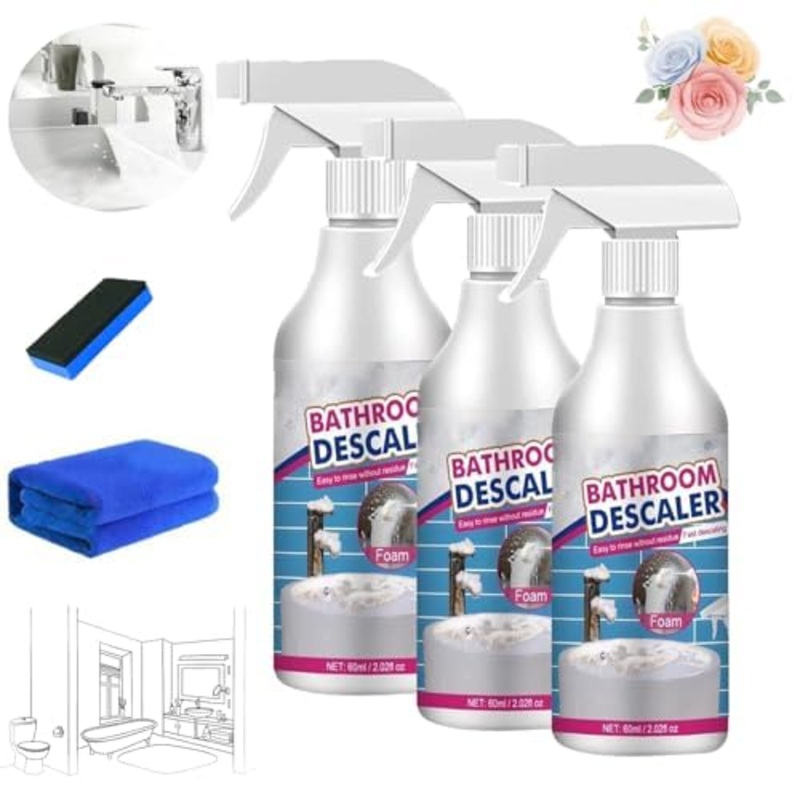 Acssart Bathroom Descaler Cleaner,Bathroom Descaler Stubborn Stains Cleaner, Acssart Foam Cleaner Bathroom, Bathroom Descaler Foam Cleaner, Multipurpose Bathroom Foam Cleaner How to Use: 1.Spray Directly on Desired Area. 2.Wipe with a Towel or Sponge Until the Stain is Removed. 3.No Need to Rinse. Simply Wipe off the Foam with a Towel After Cleaning. Specifications: Product Name: Stubborn Stains Cleaner Color: White Material: Liquid Capacity: 60ml Shelf Life: 3 years Uses: Kitchen, bathroom, degreg, rust removal Package Includes: 1 2 3 4 PCS Bathroom Descaler Cleaner 1PCS Magic Cleaning Sponge 1 PCS Fiber Cloth Notes: 1.Due to Manual Measurement, Please Allow 1-5g 1-2cm Difference. 2.Due to Different Monitors and Different Lighting, the Pictures May Not Reflect the Actual Color of the Goods. Thanks for Your Understanding.?Wide Application?: All-Purpose Foaming Stain Cleaner is widely used in toilets, squatting pans, urinals, sinks, washbs, tile walls, floors, glass, mirrors, bathtubs, faucets, etc. Great for bathroom and kitchen cleaning, saving you a lot of time and effort. ?Easy to Use?Stubborn Stains Cleaner, all purpose kitchen bubble cleaner with a no-rinse design and rich foam, just spray directly on the desired area, then wipe with a towel or sponge. ?Safe Ingredients?: Bathroom Descaler Cleaner is formulated with safe ingredients that are gentle yet effective. The concentrated formula easily emulsifies oil and dirt, creating a dense lather on contact that keeps hands or items safe and fast. ?Powerful Decontamination?: Bathroom Descaler Cleaner is a penetrating foam cleaner that easily dissolves grime, stains, grease, soap scum, etc. Makes deep cleaning easier and keeps the bathroom sparkling. ?Daily Stain Remover?: Quick removal of stubborn stains grime. Ideal for virtually all bathroom surfaces-bathtub, washb, tiles, toilet bowl.