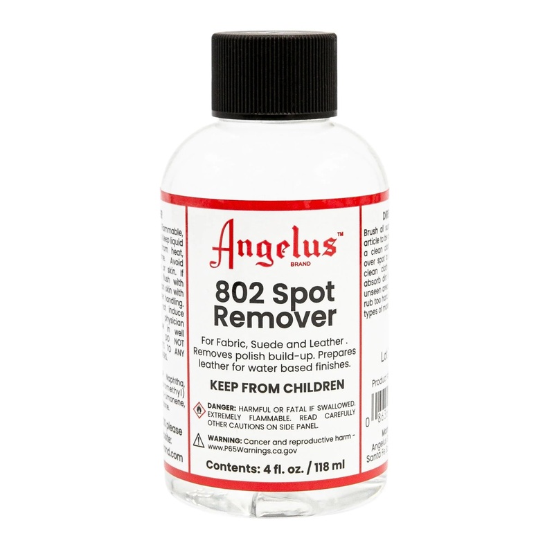 Angelus 802 Spot Remover is perfect for leather and fabric crafters who require long drying or working times or are wary of using harsh chemicals. The gentle formula can be used to spot-clean fabric, suede, and leather and won?t evaporate as fast as a dry cleaner. Use it to remove polish buildup or to prepare leather for dyeing and painting. Made in the USA. – Angelus 802 Spot Remover – 4 oz, BottleAngelus 802 Spot Remover – 4 oz, Bottle.