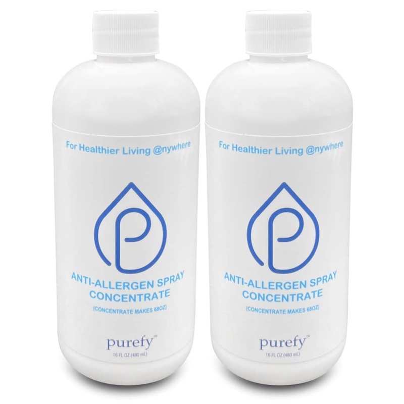 PUREFY Anti-Allergen Spray Concentrate (2pk, makes 136oz), Hypoallergenic. Eliminate Irritating Matters and Odor. Baby Safe. Unscented. No Residue. For Cleaner and Healthier Life!EFFICIENT: Convenient concentrate makes 68oz (1:4) ready to use solution; Save and reduce plastics waste and transportation. Environmentally friendly. Use with PUREFY Anti Allergen Spray (24oz) or Refill. ANYWHERE: Non-staining and safe for all colors, hard or soft materials including Carpeting, Upholstery, Window Curtains, Vehicle Interiors, Pet Bedding and more. PURER: Free of harsh chemicals, alcohol, benzene, synthetic fragrances, aerosol, tannic acid, parabens, phthalates. SAFER: Hypoallergenic pH neutral solution. Non-toxic, unscented, and VOC free. Safe for seniors, children and pets. HEALTHIER: Remove irritating matters and odors instantly. Prevent issues that lead to unhealthy environment and negative reactions.