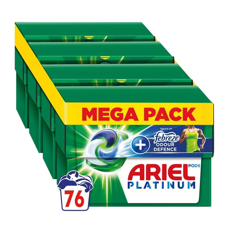 Discover Ariel PODS Platinum washing capsules laundry detergent Touch Of Febreze Odour Defence. Now coming with an additional blue chamber, they remove tough stains and odours. They have been designed for cold, with unique technologies like COOL CLEAN Technology. Wash colder with Ariel PODS Platinum : save energy in every wash and reduce your laundry’s CO2 emissions. On top, Ariel Touch Of Febreze Odour Defence washing tablets can now help reduce plastic thanks to their recyclable ECOCLIC cardboard box. It contains recycled cardboard with maximum 5 plastic, designed to preserve your PODS . Upon contact with water, their 100 water-soluble PODS film fully dissolves, even in cold, to release powerful stain-removing technologies, offering Ariel’s deepest and strongest PODS Platinum Touch Of Febreze Odour Defence clean ever. Ariel washing capsules contain 80 of biodegradable ingredients and are also produced with 100 purchased renewable electricity. WARNING: This product may be harmful and could cause serious injury. Always keep Ariel PODS Platinum washing capsules laundry detergent out of reach of children. Visit keepcapsfromkids.eu for more information. INGREDIENTS 30 Anionic Surfactants, 5-15 Soap, 5 Non-Ionic Surfactants, Phosphonates, Enzymes, Optical Brighteners, Perfumes, Alpha-Isomethyl Ionone, Benzyl Salicylate, Coumarin, Hexyl Cinnamal, Limonene, Linalool MANUFACTURER CONTACT INFORMATION Procter Gamble UK, Weybridge, Surrey, KT13 0XP See moreECOCLIC CARDBOARD BOX: Let’s reduce plastic with Ariel PODS Platinum washing tablets now coming in a recyclable cardboard box, contains recycled cardboard with maximum 5 plastic, designed to preserve your PODS. WASH COLDER WITH ARIEL PODS PLATINUM: Save energy in every wash and reduce your laundry’s CO2 emissions. DESIGNED FOR COLD: Ariel PODS Platinum washing capsules now come with unique COOL CLEAN Technology. ALL-IN-1 POWER: 1. Lift stains 2. Brighten 3. Freshen 4. Protect fabrics 5. Brrrilliant in a colder wash ANTI-ODOR ACTION. DEEP DOWN CLEAN ANTI-ODOR ACTION: Ariel PODS Platinum washing capsules now come with an additional blue chamber, and remove tough stains and odours.