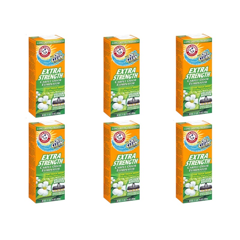 Arm & Hammer Extra Strength Odor Eliminator for Carpet and Room, 30 Ounce (Pack of 6) by Arm & HammerThe power of baking soda absorbs and eliminates carpet odors caused by smoke, mold, mildew and food spills. Unwanted hair and dirt are vacuumed with ease, and odors are destroyed deep down at the source. Pack of 6 30 oz Powder in each Pack. Fresh Scent Odor Eliminator. Arm & Hammer Plus OxiClean.