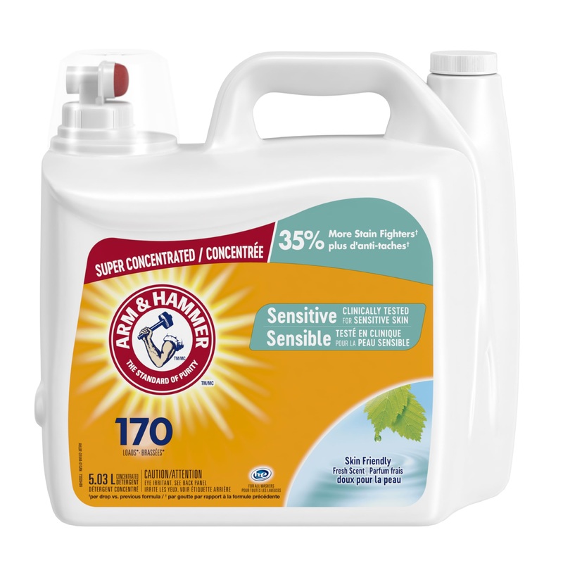 ARM HAMMER’s concentrated liquid detergents are formulated with less water and smaller packaging, reducing plastic and water used per load. With 35 More Stain fighters per drop, ARM HAMMER Concentrated Liquid Laundry Detergent requires a smaller dose per load than prior formulas, while still offering the same cleaning power in every wash load today as before. ARM HAMMER Sensitive Skin plus Fresh Scent is a liquid detergent specially designed for sensitive skin, and it smells great too! The advanced dye-free laundry detergent has a light, fresh fragrance designed and clinically tested to be gentle on sensitive skin. This liquid laundry detergent harnesses the pure, freshening power of ARM HAMMER Baking Soda to wash away dirt and odours. After each wash, your laundry is left clean and smelling great with a fresh, hypoallergenic scent. This low-suds formula provides a clean rinse and is compatible with both standard washers and today’s energy-conscious High-Efficiency (HE) machines Directions: Fill cap to Bar C for medium loads. For large or heavily soiled loads, fill cap to 1 2 capful.PURE BAKING SODA NATURALLY REMOVES STAINS and brightens clothes in both standard and high efficiency (HE) washers. GENTLE ON SKIN, with a fresh skin-friendly scent. REDUCING OUR ENVIRONMENTAL FOOTPRINT by saving on plastic, water, and fuel all with the deep clean you expect from ARM HAMMER. FREE OF DYES, for Sensitive Skin. SUPER CONCENTRATED WITH 35 MORE STAIN FIGHTERS per drop vs. previous formula.