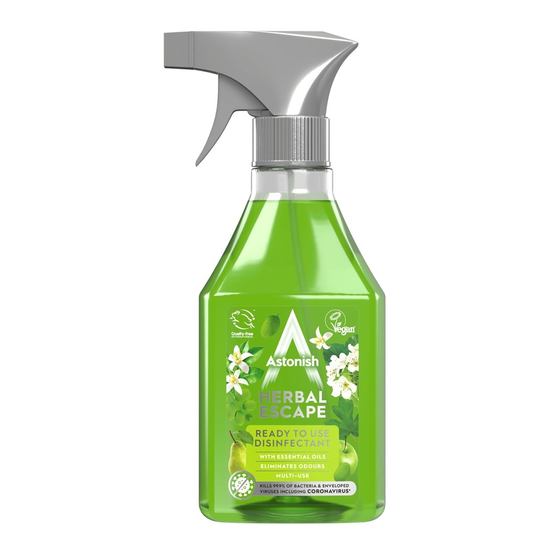 Here at Astonish we are proud of our products. Whatever your cleaning problem we aim to have a helpful cleaning solution. Now were not saying that we can work miracles, lets be realistic cleaning can on occasions be hard work, but weve taken the time to ensure weve developed products that get the job done right, nothing less. Astonish have made multi-purpose cleaning a breeze with their ready to use disinfectant spray. Simply spray on surfaces and wipe to eliminate 99.9% of bacteria and viruses in just one use. Plus, the essential oils blended into the formula, will leave your home smelling fabulous and fresh. Each bottle includes 550ml of disinfectant, helping you keep your home fresh and free of nasty germs for even longer. Were also proud to say that here at Astonish we pride ourselves on making vegan and cruelty-free cleaning products. How to use: To fully disinfect an area, spray and leave for 5 minutes, then wipe clean with a dry cloth. KEEP OUT OF REACH OF CHILDREN. Read label before use. If medical advice is needed, have product container or label at hand. Avoid breathing spray. IF ON SKIN: Wash with plenty of soap and water. Avoid contact with face and eyes. INGREDIENTS <5% cationic surfactants, <5% disinfectants, <5% perfumes DIRECTIONS Remove visible soiling. Spray surface and leave. Wipe with a clean damp cloth. Use all around the home and leave for 5 minutes for complete disinfection before wiping off. CAUTION: Use biocides safely. For use on non-porous hard surfaces. Allow treated surfaces to fully dry before introduction of children or pets. Allow food preparation surfaces to dry before use. Do not use directly on food. Not for use as a steriliser for baby utensils. Store in a cool, dark place. SAFETY WARNING sytay away from eye contact See moreASTONISH 550ML DISINFECTANT READY TO USE HERBAL ESCAPE 02/26 05/26 11/26.