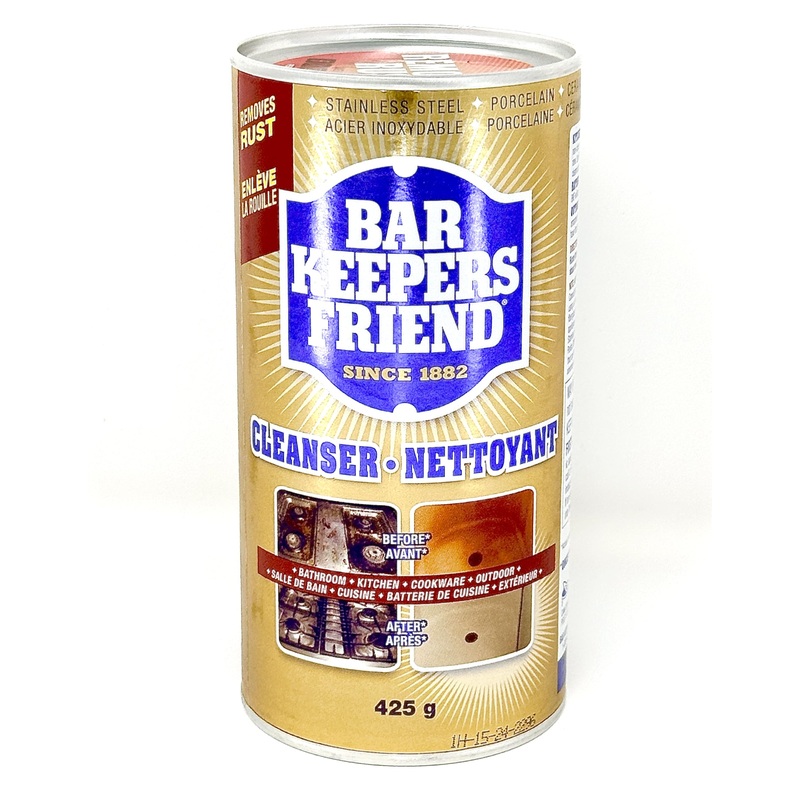 This Bar Keepers Friend Cleanser and Polish is the premium household powdered cleanser with a non-bleach formula. BKF is recommended for cleaning stainless steel cookware and sinks, glass and ceramic cook-tops, solid surface countertops, porcelain and acry