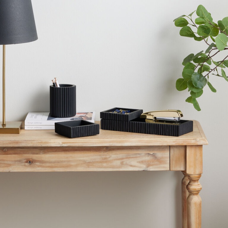 Our exclusive Blane desk trays are hand carved in India of mango wood with a modern matte-black finish. A sleek, on-trend way to tidy cords, notepads and other desk accessories, this home-office storage is complete with contemporary fluting. This one-of-a-