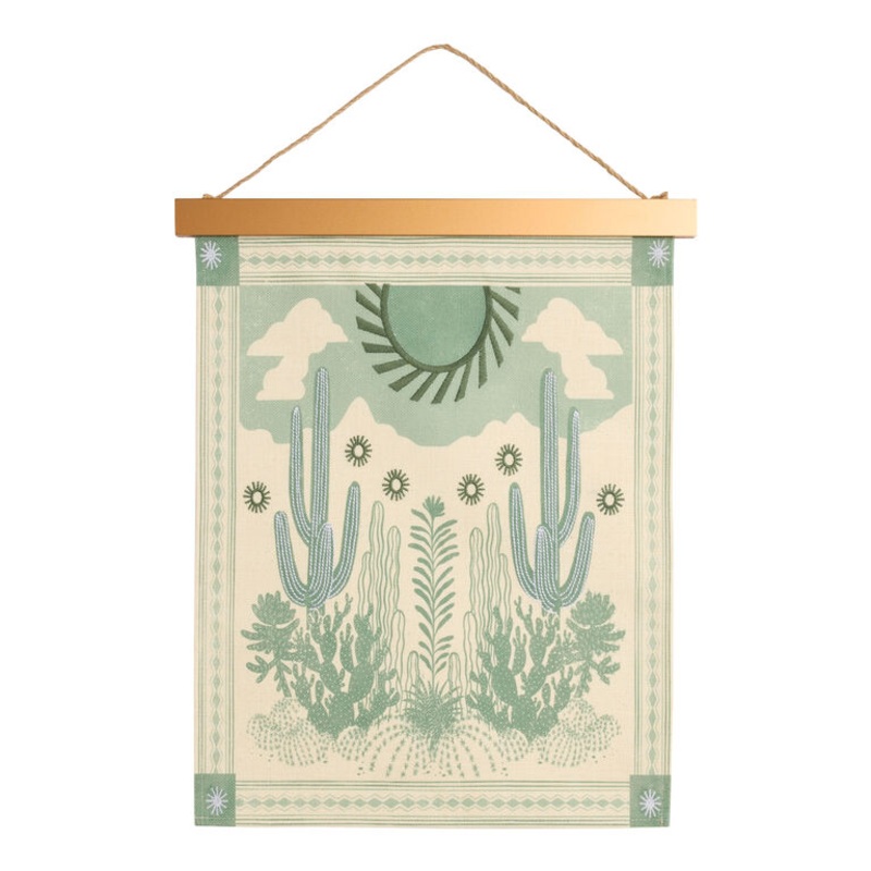 Give your home decor a soft desert vibe with our natural linen scroll depicting an embroidered, sage-green cactus garden. Topped with a flat, pine-wood dowel in a natural finish, the symmetrical illustration is bordered with a geometric design that adds se