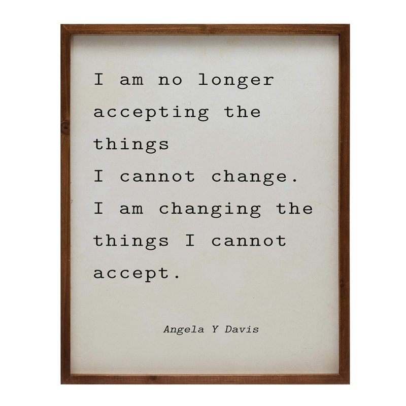 This engaging and uplifting framed wall dcor reads, "I am no longer accepting the things I cannot change. I am changing the things I cannot accept." A thought-provoking and simple accent piece that will look great in any room in your home or office. And it