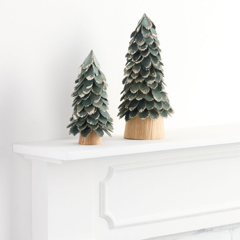 Rustic charm and seasonal sparkle combine in our tabletop tree decor, densely layered with delicate slivers of deep-green wood tipped with silver glitter. Sprouting from a broad paper-wrapped trunk and available in two sizes, it’s a woodsy, welcoming addition to your Christmas village or holiday display.