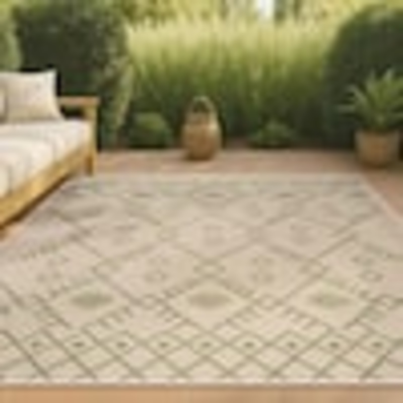 Inspired by vintage Beni Ourain Moroccan rugs, our indoor/outdoor rug adds modern Bohemian style to your porch, patio or sunroom. The classic Moroccan pattern has a geometric design of green diamonds on a field of beige. Mingled threads give this rug a handwoven, vintage vibe that’s perfect for an entry, kitchen, hallway, living room or bedroom too. The pet-friendly and kid-proof flatweave design makes it easy to clean, and perfect for the beach house.