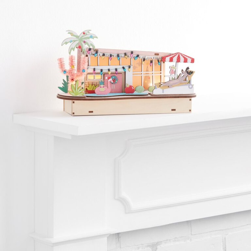 Move vintage appeal into your Christmas village with our exclusive mid-century house and pool, crafted of laser-cut wood and delightfully detailed. Featuring the clean lines and cool vibes of classic MCM design, this light-up decoration is fitted with LED