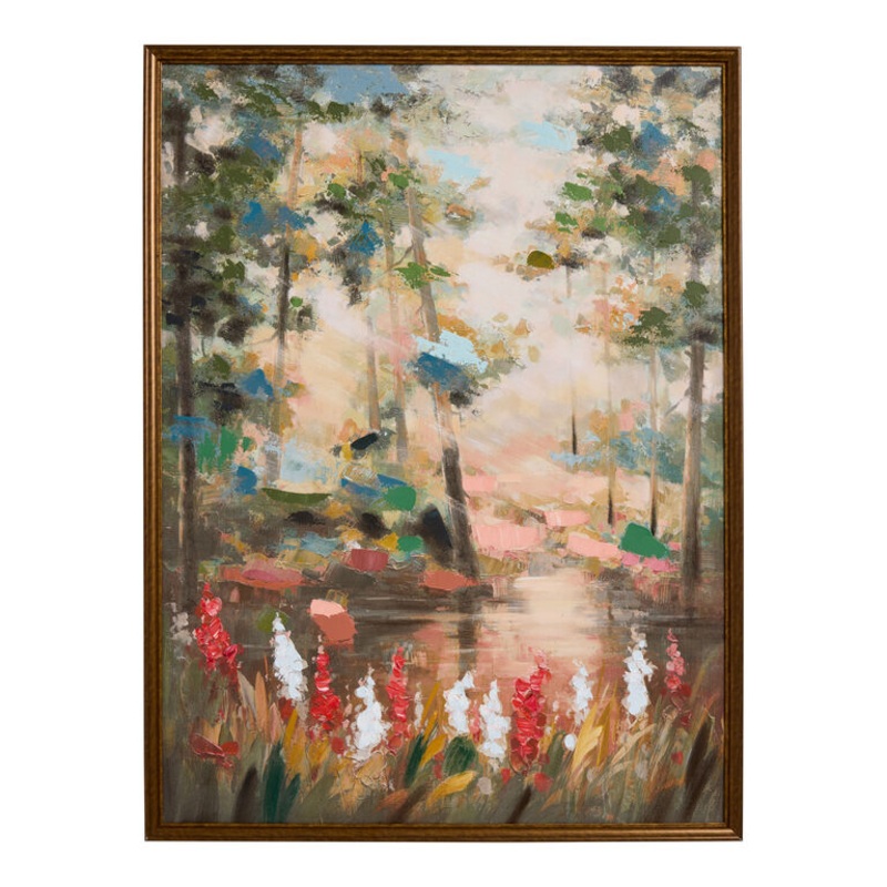 A tranquil pond is surrounded by tall, leafy green trees and bursts of red and white florals in our exclusive framed wall art. Textural, hand-painted brushstroke embellishments in coral, forest green and earthy browns create a lively landscape that lends a