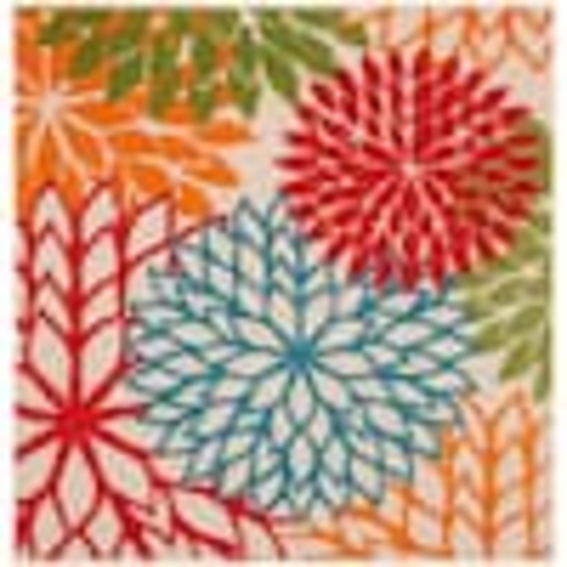 Bring extra life and excitement to your patio, deck, or porch with this Aloha floral outdoor rug. The high-low construction, presented in orange, red, and green add a festive touch of the tropics to your patio, deck, or porch. This rug is machine-made from premium stain-resistant fibers that are easily washable with a hose: simply rinse and allow both sides time to fully air dry. To extend the life of your rug, bring indoors during extreme weather.