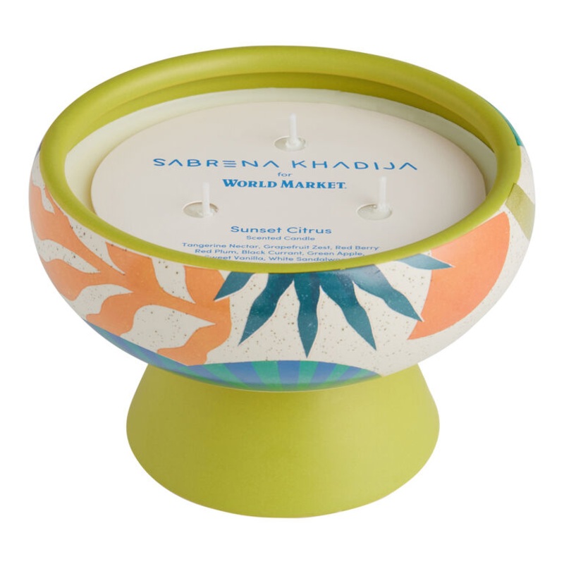 Made exclusively for us by artist Sabrena Khadija, this Sunset Citrus scented candle comes in a wide ceramic bowl full of vibrant color and abstract appeal. Often inspired by her Sierra Leonean heritage and the West African art that hung in her childhood home, the DC-based illustrator works in bold tones and shapes. A fragrant addition to any mantel or shelf – with notes of juicy fruit and soft sandalwood – this stylish decor makes a chic gift.