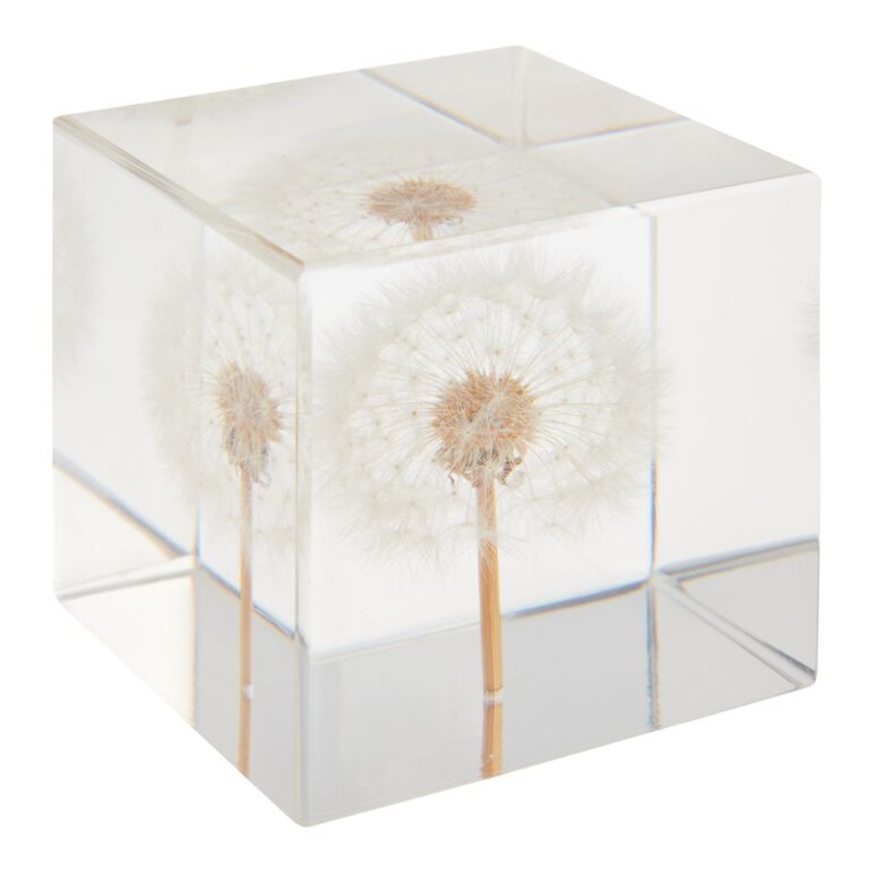 Etched with a lifelike dandelion flower on the inside, our clear cube paperweight brings a natural touch to your workstation. With a dimensional, museum-like quality, this artful and petite desk accessory keeps your papers organized and in place.