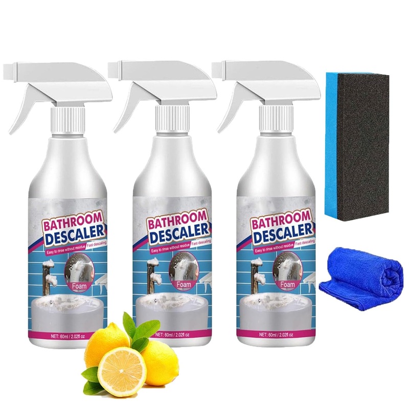 Specifications — Name — All-Purpose Bathroom Descaler Foam Spray Color — White Material — Liquid Capacity — 60ml Shelf Life — 3 years Uses — Kitchen, bathroom, degreg, rust removal Package Includes — 1 2 3 PCS x Stubborn Stains Cleaner 1PCS x Sponge 1 PCS x Fiber Cloth How to Use — 1.Spray Directly on Desired Area. 2.Wipe with a Towel or Sponge Until the Stain is Removed. 3.No Need to Rinse. Simply Wipe off the Foam with a Towel After Cleaning. Note — 1. Please allow slight dimens error due to manual measurement.Thank you for your understanding 2. Due to different monitors and different lighting, the picture may not show the actual color of the item. Thank you for your understandingEasy to Use — Bubble cleaner all-purpose rinse-free cleaning spray, all purpose kitchen bubble cleaner with a no-rinse design and rich foam, just spray directly on the desired area, then wipe with a towel or sponge. Versatility — This powerful Multipurpose Bathroom Foam Cleaner works as a stainless steel cleaner, toilet cleaner, kitchen countertop cleaner, car interior cleaner, and more, providing streak-free results on any surface. Safe Ingredients — All purpose kitchen bubble cleaner is formulated with safe ingredients that are gentle yet effective. The concentrated formula easily emulsifies oil and dirt, creating a dense lather on contact that keeps hands or items safe and fast. Quick Cleaning — Effortlessly clean your bathroom with Bathroom Descaler Cleaner. just spray it on the stained surface, wait 5-10 minutes for the bubbles to work, and then wipe away for a spotless, stain-free finish. Stubborn Stains Cleaner — All-Purpose Bathroom Descaler is a penetrating foam cleaner that easily dissolves grime, stains, grease, soap scum, etc. Bubble cleaner foam makes deep cleaning easier and keeps the bathroom sparkling. Eliminates odor and deodorizes with a fresh scent.