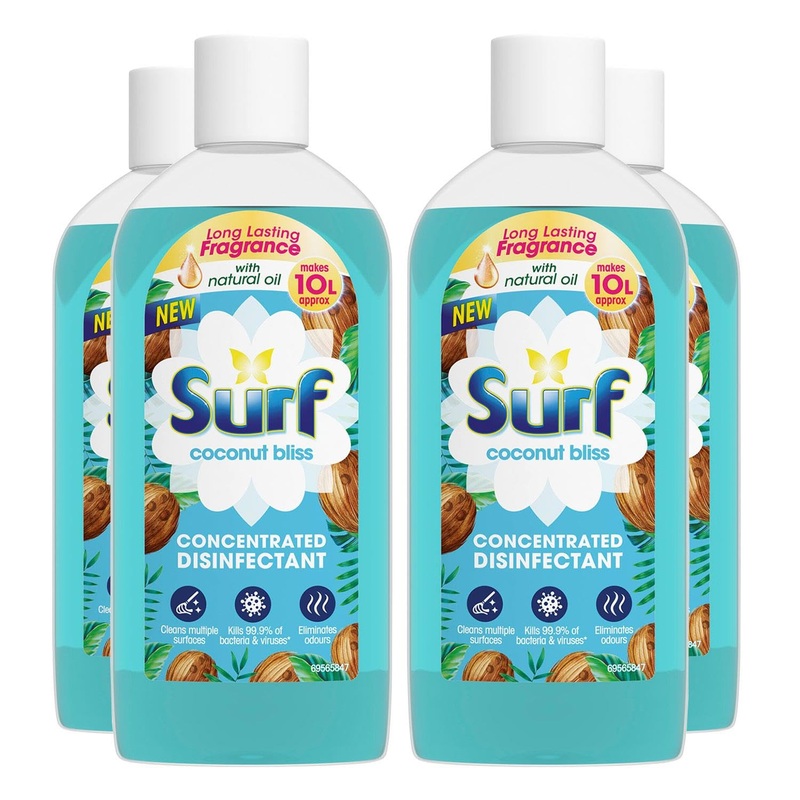 Looking for a way to keep your home hygienically clean while leaving it with a fresh and clean fragranceLook no further! Eliminate 99.9 of bacteria and viruses and leave surfaces with a long-lasting fragrance with Surf Passion Bloom, Coconut Bliss or Tropical Lily Concentrated Disinfectant. Featuring a powerful formula containing natural oil, this multi-purpose cleaner is perfect for cleaning almost any surface, so it can be used as a bathroom or kitchen cleaner to eliminate odours and keep your home wonderfully fresh. What’s more, this concentrated multi-purpose cleaner makes approximately 10 litres when diluted perfect for bigger households! Keeping your home wonderfully fresh and hygienically clean has never been easier with Surf Passion Bloom, Coconut Bliss or Tropical Lily Concentrated Disinfectant Liquid. Features: Surf Passion Bloom Concentrated Disinfectant has a long-lasting passion fruit, mango lychee fragrance Surf Coconut Bliss Concentrated Disinfectant has a long-lasting, fresh and clean coconut fragrance Surf Tropical Lily Concentrated Disinfectant has the long-lasting, gorgeous scent of one of nature’s most enticing flowers Our concentrated surface cleaner features a powerful formula containing natural oil This concentrated disinfectant makes approximately 10 litres (only use diluted) This multi-purpose cleaner is perfect for cleaning almost any surface around your home Our all-purpose cleaner eliminates 99.9 of bacteria and viruses while leaving surfaces fresh and clean With a powerful cleaning formula, this liquid disinfectant eliminates tough odours Box Contains: Surf Concentrated Disinfectant Multi-Purpose Cleaner, 240mlHow to Use: Apply onto surface, leave for 15 minutes and then wipe evenly with a damp cloth. Once diluted, use immediately. Do not store the diluted product. Keep the bottle closed. Before applying the product on delicate, new and unusual surfaces, test first on a small inconspicuous area. Always follow your appliance and surface manufacturers’ usage instructions. Do not use on painted wood, linoleum and marble. Long-Lasting Fragrance: Surf Concentrated Disinfectant has a long-lasting, fresh and clean Fruity and tropical fragrance keeping your home wonderfully fresh and hygienically clean has never been easier with Surf Tropical Lily Concentrated Disinfectant Liquid. Powerful Cleaning Formula: This concentrated multi-purpose cleaner makes approximately 10 litres when diluted perfect for bigger households! With a powerful cleaning formula, this liquid disinfectant even eliminates tough odours. Multi-Purpose Cleaner: Featuring a formula containing natural oil, this multi-purpose cleaner is perfect for cleaning almost any surface, so it can be used as a bathroom or kitchen cleaner to eliminate odours and keep your home wonderfully fresh. Surf Disinfectants: Looking for a way to keep your home hygienically clean while leaving it with a fresh and clean fragranceLook no further! Leave surfaces with a long-lasting floral fragrance with Surf Concentrated Disinfectant.