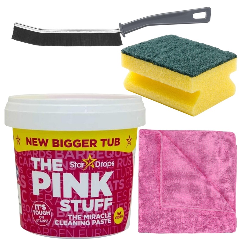 The Pink Stuff Miracle household multipurpose cleaning Paste 850g is perfect for cleaning dirt, grime and stains on saucepans, cooker tops, sinks, uPVC, barbecues, ceramic tiles, glass, showers, and grease from various surfaces. The package includes: 1x Pink Stuff Miracle Paste 1x Crevice cleaning brush 1x Ultra absorbent microfiber cloth 1x Non-scratch cleaning spongeThe ultra absorbent micro-fibre cloth and the non-scratch cleaning sponge are suitable for applying the paste to surfaces. Non-Toxic Non-hazardous formulation, made from 99 Natural Ingredients.The Paste can be easily applied on surfaces using a soft cloth or a sponge. Rub gently with care before rinsing off with hot water. The crevice brush precisely cleans and eliminates dirt from tight gaps and spaces throughout your home, including kitchens, bathrooms, taps, faucets, corners, tile surfaces, shower door tracks, window frames, sink drains, and sliding door tracks. The Pink Stuff Miracle Paste 850g is perfect for cleaning dirt, grime and stains on saucepans, cooker tops, sinks, uPVC, barbecues, ceramic tiles, glass, showers, and grease from various surfaces. The package includes 1x Pink Stuff All Purpose Cleaning Paste 850g, 1x Ultra absorbent microfibre cloth 1 x Non-scratch cleaning sponge.