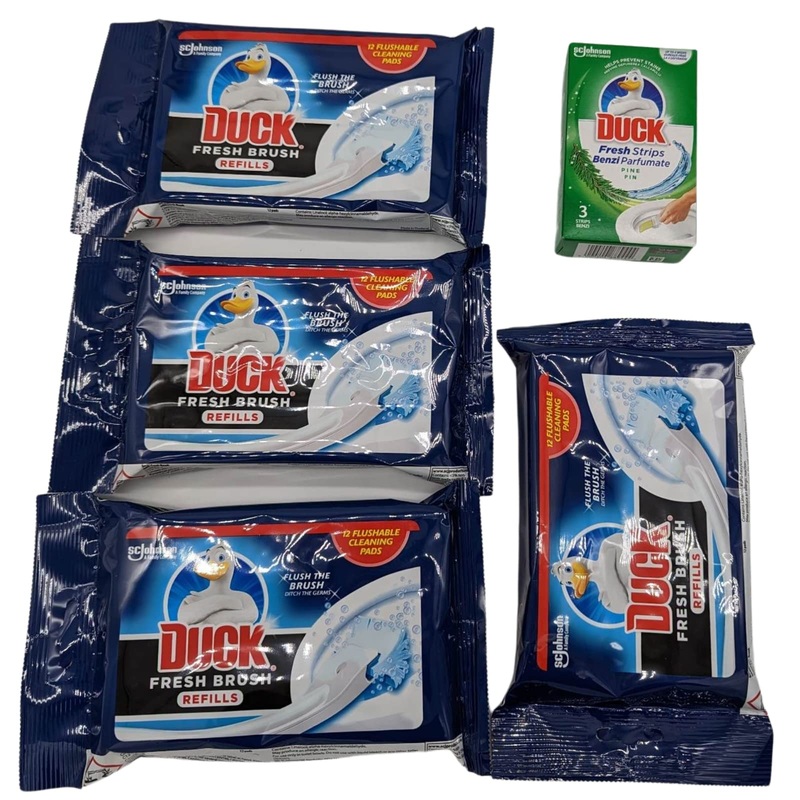 Toilet Cleaner Duck Bundle With 4x Duck Toilet Cleaner Fresh Brush Refills 12pads And Duck Pine Toilet Cleaner Fresh 3 Strips – Bathroom Cleaner Disposable Toilet Brush Preparation and Usage for Duck Toilet Fresh Brush Refills HOW TO ASSEMBLE: 1. Push together 2 handle pieces until tabs lock. Assembly is permanent. 2. Cut open pouch. Break 1 of the 4 pads and close pouch with resealable tape. 3. To insert cleaning pad, slide blue button forward, insert pad & slide button back. Button will click when closed. 4. Assemble the holder by clipping the 2 pieces together.Duck Fresh Strips is a gel base formula that self-sticks to the toilet bowl so you don’t have to worry about germy cages. Its powerful and smart formula activates with every flush leaving a protective shield all around the toilet bowl. Simply self-stick to the inside of your toilet to keep it clean and fresh with every flush. Try Duck, makes a tough job easy!. The flushable pads are biodegradable and safe for septic systems, making them an environmentally friendly option. A duck toilet cleaner that helps to remove toilet stains with ease. Button on Duck Fresh Brush holder allows you to easily dispose and flush cleaning pads in toilet bowl. A toilet cleaner that provides powerful foaming clean action, alongside a fresh citrus scent when in contact with toilet water. Duck Fresh Brush Refill contains 12 Duck flushable cleansing pads. 1x Duck Pine Toilet Cleaner Fresh 3 Strips. 4x Duck Fresh Brush Toilet Cleaning System Refill Pack 12 Flushable Cleaning Pads.