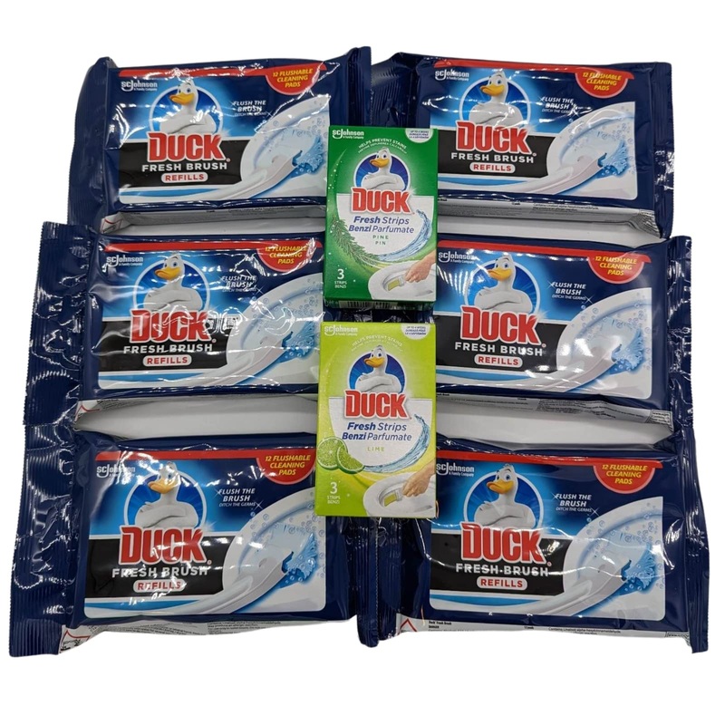 Toilet Cleaner Duck Bundle With 6x Duck Toilet Cleaner Fresh Brush Refills 12pads, Duck Pine Toilet Cleaner Fresh 3 Strips And Duck Lime Toilet Cleaner Fresh 3Strips -Bathroom Cleaner Disposable Brush. Preparation and Usage for Duck Toilet Fresh Brush Refills HOW TO ASSEMBLE: 1. Push together 2 handle pieces until tabs lock. Assembly is permanent. 2. Cut open pouch. Break 1 of the 4 pads and close pouch with resealable tape. 3. To insert cleaning pad, slide blue button forward, insert pad & slide button back. Button will click when closed. 4. Assemble the holder by clipping the 2 pieces together.Duck Fresh Strips is a gel base formula that self-sticks to the toilet bowl so you don’t have to worry about germy cages. Its powerful and smart formula activates with every flush leaving a protective shield all around the toilet bowl. Simply self-stick to the inside of your toilet to keep it clean and fresh with every flush. Try Duck, makes a tough job easy!. The flushable pads are biodegradable and safe for septic systems, making them an environmentally friendly option. A duck toilet cleaner that helps to remove toilet stains with ease. Button on Duck Fresh Brush holder allows you to easily dispose and flush cleaning pads in toilet bowl. A toilet cleaner that provides powerful foaming clean action, alongside a fresh citrus scent when in contact with toilet water. Duck Fresh Brush Refill contains 12 Duck flushable cleansing pads. 1x Duck Lime Toilet Cleaner Fresh 3 Strips. 1x Duck Pine Toilet Cleaner Fresh 3 Strips. 6x Duck Fresh Brush Toilet Cleaning System Refill Pack 12 Flushable Cleaning Pads.