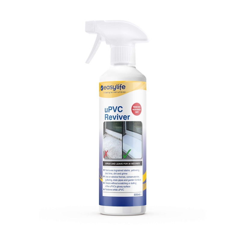 Now discoloured uPVC window frames, conservatories, guttering, drain pipes and garden furniture can be cleaned in just 30 seconds. Easyclean’s uPVC Reviver is super-efficient at removing ingrained stains, yellowing, bird lime, dirt and grime – without scratching or dulling the glossy surface. It does what it says on the can – just spray, leave for 30 seconds to work its magic leave, then wipe off with a damp cloth and the job’s done. Supplied with spray head in a 500ml bottle. Restores white uPVC.Supplied with spray head in a 500ml bottle . Supplied with spray head in a 500ml bottle . Just spray and leave it for half a minute to work its magic . Restore uPVC window frames to as-new whiteness… in seconds!.