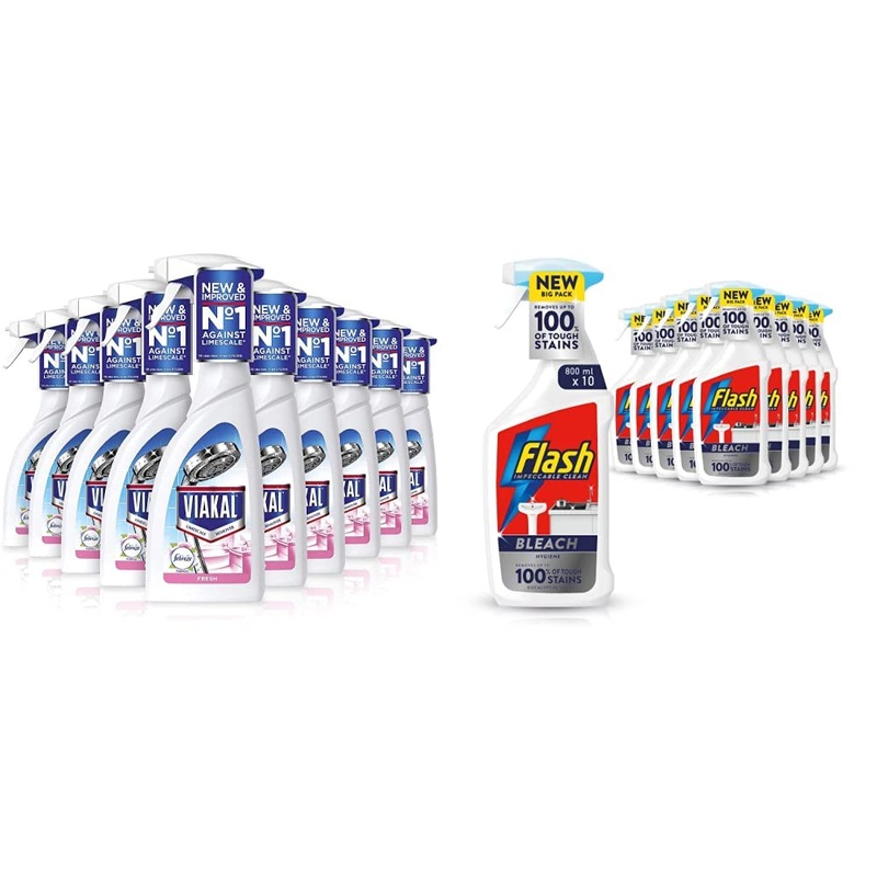 Viakal Limescale Remover Spray, Fresh, 5 Litre (500 ml x 10) Viakal Bathroom 3in1 not only removes lime scale, soap scum and watermarks, but also eliminates 99.9% of bacteria for deep hygiene. Ideal for regular use in your bathroom to provide clean and shiny surfaces every day. Viakal Spray limescale remover is ideal for vertical surfaces, not only providing a thorough clean, but also a long-lasting shine. Its special formula creates a barrier to prevent watermarks from returning, even in hard water areas.Its formula respects your surfaces, so it can be used every day to clean a variety of spaces exposed to water. Flash Bleach Spray Multi Purpose Cleaner, 8 Litres (800 ml x 10), Stain & Grease Remover, Eucalyptus Scent Flash Multi Purpose Bleach Cleaning Spray is perfect for cleaning almost any hard surface in your Bleach. Use it on all Bleach surfaces. See package for full usage instructions. A rinse is required for surfaces in direct contact with food.Product 2: Powerful Cleaning. Product 2: Cuts Grease. Product 2: Flash Clean & Shine, 100% streak-free shine (tested with liquid form on ceramic floor tiles). Product 2: All purpose cleaner with the great cleaning power of Flash. Product 1: Eliminates soap scum. Product 1: Eliminates 100% of limescale. Product 1: Eliminates 99.9% of bacteria. Product 1: Viakal limescale remover cleaning spray.
