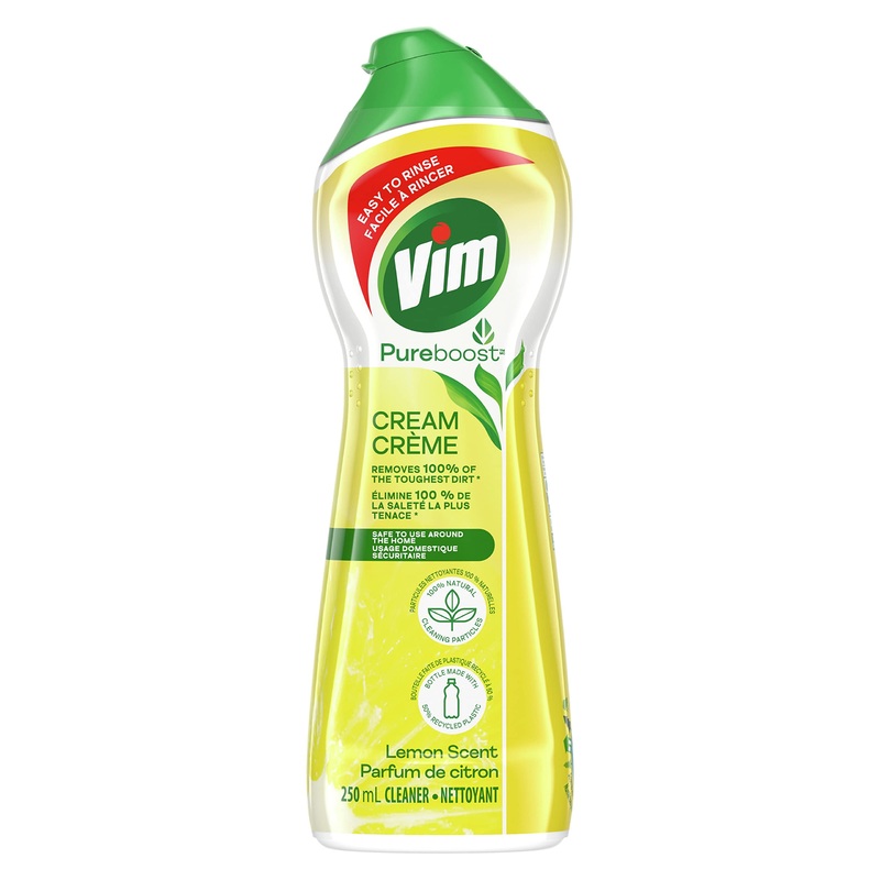 With Vim Cream, you don’t need to worry about household mess. A multi-purpose cleaner that can be used both as a bathroom cleaner and kitchen cleaner, it is a household multi-tasker that’s tough on dirt, scum, watermarks, grease and burnt-on food, and can help make things look new again. Vim’s famously tough Cream Cleaner cares for your surfaces by removing tough dirt you never thought you’d get rid of, thanks to micro-particles that lift grime away for a shiny and streak free result . Containing 100 natural cleaning particles, Vim Cream is a great cleaner for every room, leaving a fresh Lemon Scent. To use, simply squirt cream directly onto the surface or a damp sponge and rub gently. Rinse thoroughly, then wipe clean promptly, repeating if necessary. There’s always a beautiful ending when you start with Vim. Do not use on wood, aluminum, worn or scratched surfaces. When using on chrome or plated surfaces, rinse immediately after use. Available in a range of fresh scents, this multi-surface cleaner’s packaging is made with 50 recycled plastic while working towards 100 recycled. At Vim, we believe that a beautifully clean home is a joy to live in. All our household and cleaning products are formulated with this in mind. By choosing Vim, you know there’s always a beautiful ending – whatever the surface, whatever the room, whether it’s a quick spruce-up, or a full deep clean. Tested on model kitchen and bathroom dirt and surfaces, achieving complete soil removal.This multi-purpose cleaner packaging is made with 50 recycled plastic while working towards 100 recycled. Add this to your cleaning products as it contains 100 naturally derived descaling agent. This Vim Cream kitchen and bathroom cleaner is complete with a fresh lemon scent. Made with micro-crystals, this cleaner is tough on dirt, scum, watermarks, tough grease and burnt-on food. This surface cleaner works as a bathroom cleaner and kitchen cleaner, which means it is a must in your cleaning supplies. Vim PureBoost Multi-purpose Cream Cleaner Lemon Scent is a versatile, multi-purpose cleaner that removes tough dirt.
