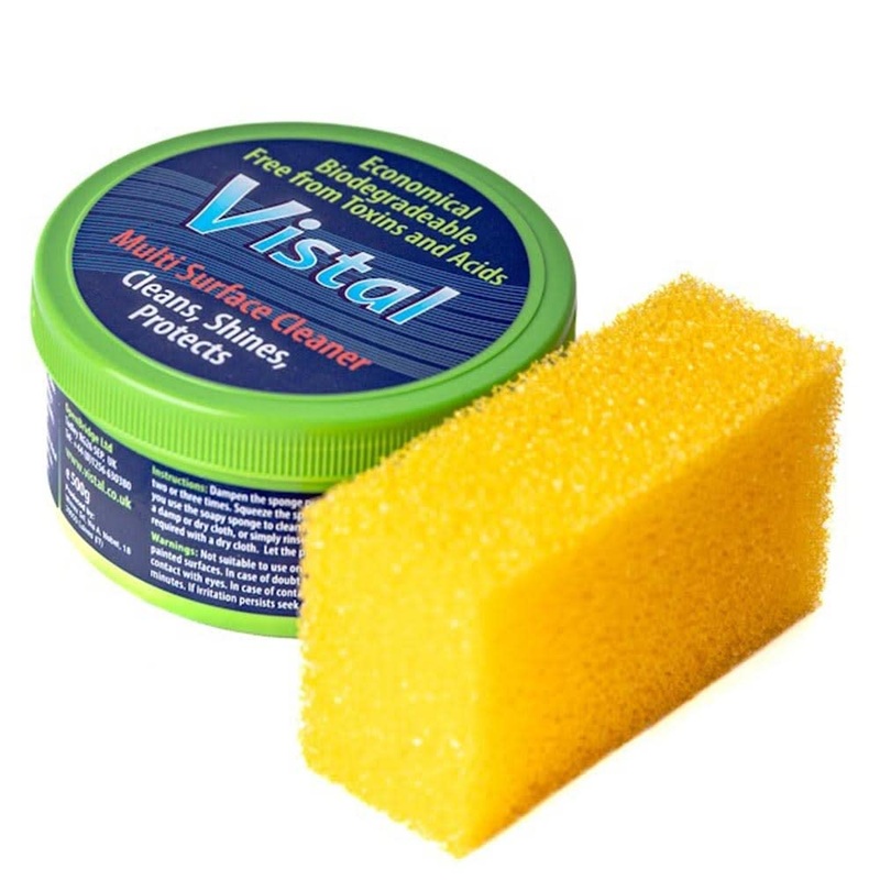 Vistal Cleaner one pot does the lot.SAFE FOR YOU, YOUR PETS AND THE ENVIRONMENT. Contains no chemicals, toxins, acids, ammonia, VOCs, bleach or phosphates. Septic tank friendly. Safe for allergy sufferers and pets. Safe to use without gloves. PROTECTS AND SHINES. Natural glycerine leaves an even, streak-free shine and helps to keep surfaces clean. Cleans stainless steel, copper, brass, chrome, glass, pvc, fibreglass, vinyl and more. REMOVES TOUGH DIRT AND MARKS like grease, light limescale, burned-on food, burn marks, soap scum, water spots, scuffs, tarnish, tea stains, wax etc in your kitchen and bathrooms though the highly effective combination of natural ingredients and the special sponge. ONE PRODUCT, MANY USES. Natural, eco friendly cleaner and restorer for your kitchen and bathroom and all around your home. Cleans hobs, sinks, kettles, toasters, oven glass, tiles, baths, shower glass and more. All-purpose natural hard surface cleaner for your home and hobbies. Comes with 1 x special sponge.