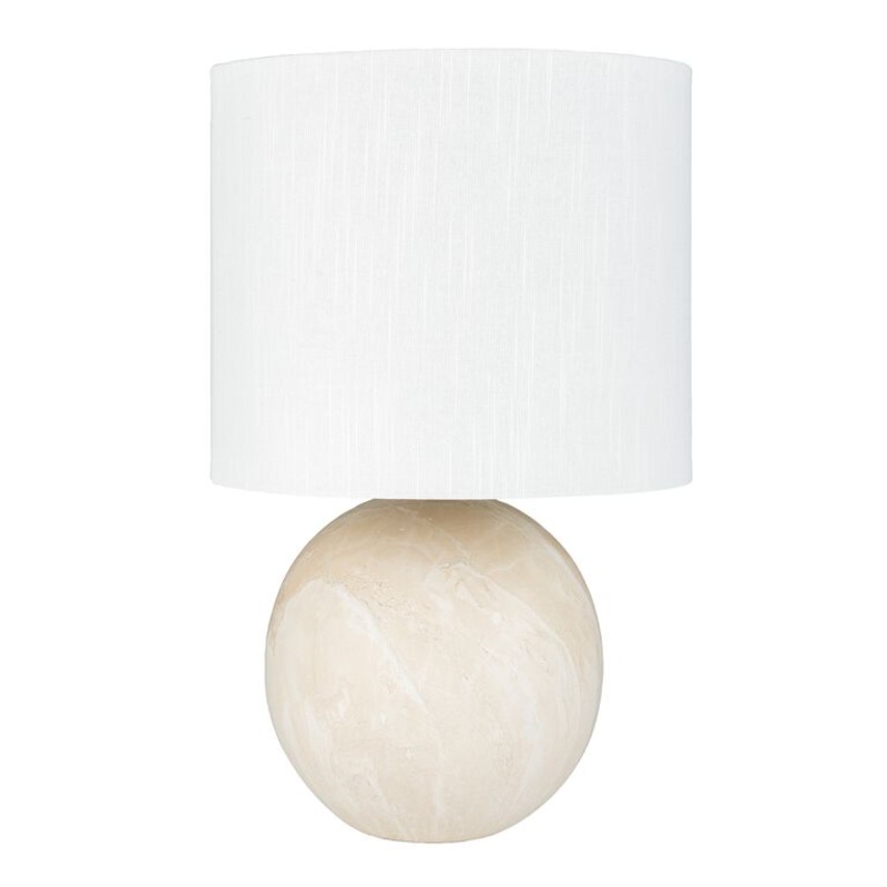 The Vogel table lamp from Surya pairs an orb-shaped ceramic base in marbled ivory with a tall linen drum shade to present a modern geometric contrast. The artisan appeal of the marbled base is hand-finished by experts to create a dimensional texture. A scu