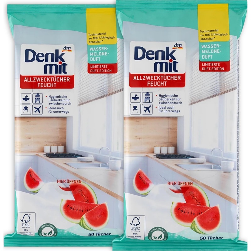 Ingredients: Less than 5 anionic surfactants Contains fragrances, preservatives (PHENOXYETHANOL) Instructions for use. AREAS OF APPLICATION: Suitable for smooth and washable surfaces. APPLICATION: Open the single towel dispenser and remove the towel. Then close the pack tightly again. Cloth is ready to use and can easily be applied by hand. Simply wipe surfaces. In the case of heavier soiling, wipe with a new cloth. Rinsing with clear water or rubbing dry is not necessary. Dispose of used wipes and empty packaging with household waste Warnings. IMPORTANT TO NOTE: Do not use for personal hygiene. Do not apply to wounds or irritated skin. First test towels on an inconspicuous area for material compatibility. Do not use dried out cloths. Do not use on painted or very sensitive surfaces (e.g. acrylic glass), polished or untreated wood, cork, textiles, upholstery or carpets. Do not use on alcohol-sensitive surfaces such as LCD or plasma screens. The product should not be exposed to high temperatures. Do not throw used towels down the toilet. Manufacturer: dm-drogerie markt GmbH Co. KG. At dm-Platz 1, 76227 Karlsruhe, Germany.The all-purpose damp cloths from Denkmit with the summery scent of watermelon are ideal for quick and easy cleaning in between – at home and on the go . New: cloth material is 100 biodegradable . Also ideal for on the go . Watermelon scent . Limited Fragrance Edition .