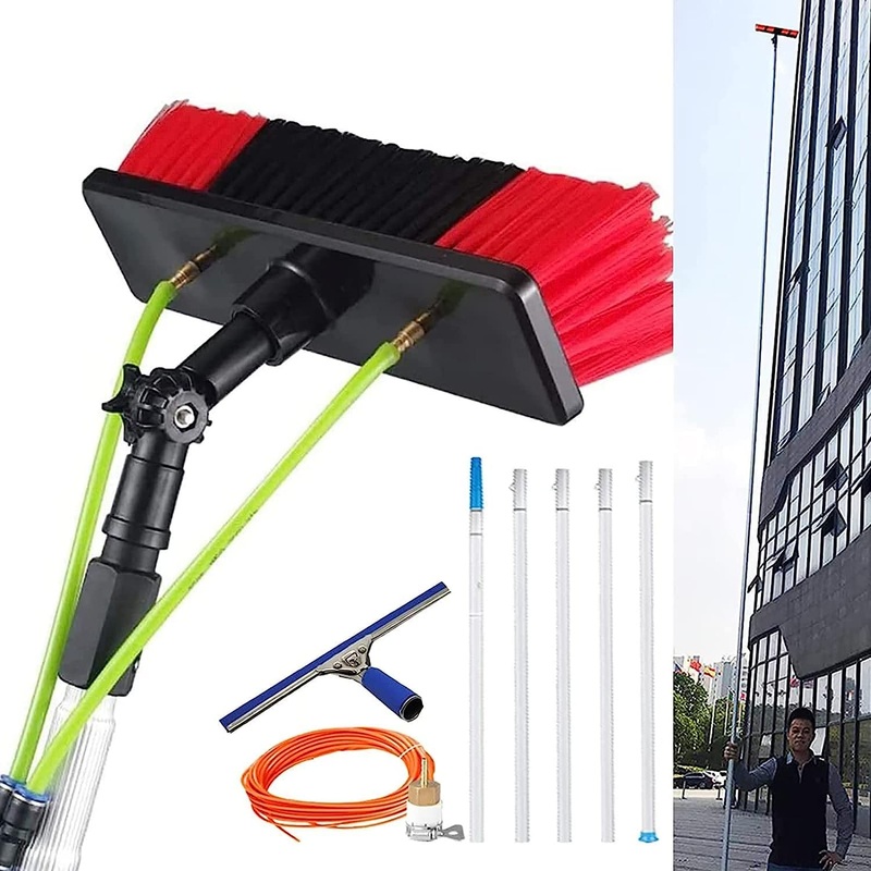 Are you still awkwardly climbing up the ladder to clean the tall windows !Telescopic Cleaning Brush Wide range of applications: Suitable for high-place window cleaning, solar photovoltaic panel cleaning, cleaning cars, trucks, vans, caravans, windows, greenhouses, ships, decks, etc. The anti-breaking joint design can be used in conjunction with a variety of cleaning methods to complete advanced cleaning operations. Professional retractable window cleaning rod: Our products are specially designed for high-altitude cleaning. Multiple rods can be connected freely without bending. The steel buckle is fixed, perfectly closed, easy to install and easy to disassemble. Fix the brush head panel or glass plate at a certain angle. The universal design allows the brush head to rotate freely, allowing you to easily solve the dust and stains in every corner. Streak free squeegee: 35cm squeegee,window cleaner pole with squeegee. Enjoy a smooth squeegee glide, no streaks.The accessory gimbal double joint allows the brush and scraper to work at the same time, making it easy to clean high-rise glass. Roof Cleaner Convenient water supply: The brass hose connector can be easily connected to the garden hose using any hardware store that provides hose connectors (quick connectors, not included). Turn on the faucet and you can immediately clean the windows, greenhouse, fascia and soffit. High-quality materials:Telescopic Window Cleaning Poles made in High-density reinforced aluminum alloy, high hardness, not easy to rust, light weight. The single pole weighs only 0.25kg and can be easily used by the elderly and women. Very durable and soft feather bristles ensure safe surface cleaning. The 20-meter water pipe easily meets your needs at any height and is easy to use.