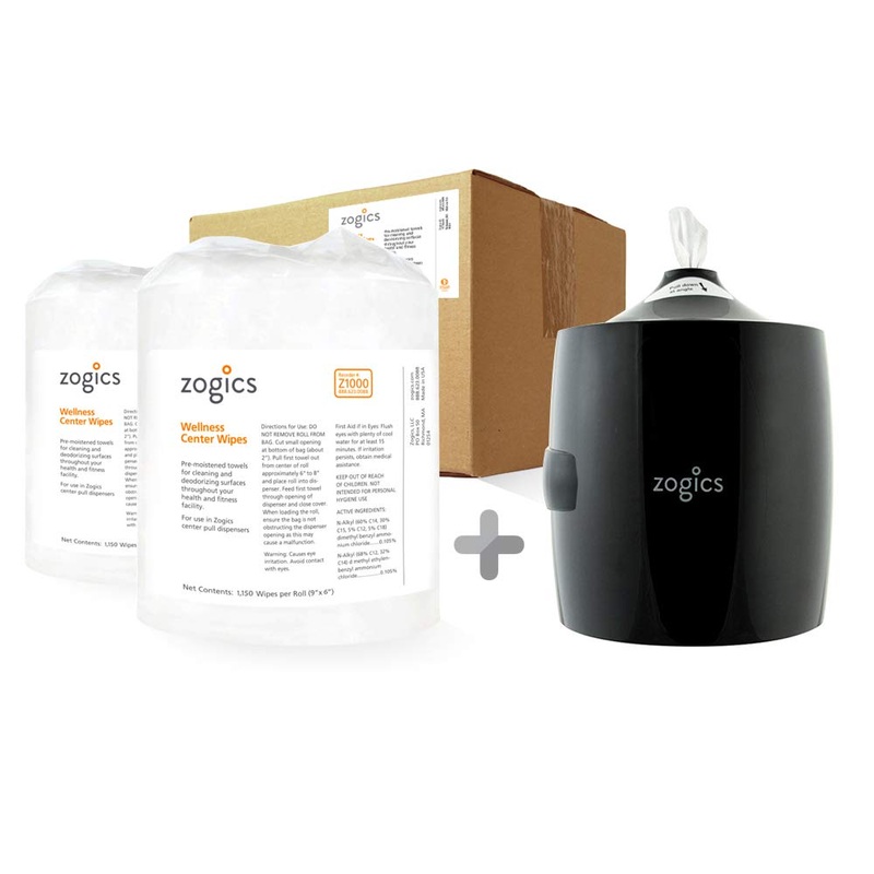 With this money-saving bundle, keeping your gym clean and tidy has never been easier. You’ll save on our bestselling Wellness Center Wipes and our Wall Mounted Gym Wipes Dispenser. Wellness Center Wipes combine the cleaning strength your fitness facility needs, with a price that wont hurt your budget. These wipes are pre-saturated with Quaternary disinfectant, and free of any alcohol, phenol, and bleach, making them an effective way to clean, sanitize, and deodorize germs and bacteria. Rolls measure at 9″ x 8.5″, while individual wipes measure 9″ x 6″, making them easy for single hand use. The other half of this duo is our Wall Mounted Wipes Dispenser. Upscale, attractive, and durable, our wall-mounted gym wipe dispensers are the perfect delivery system for our pre-moistened gym equipment wipes. You’ll love this sleek model because it’s easy to refill and install. This no-touch dispenser is also hygienic, and will help you cut down on germs, providing a healthier environment for your members. Plus you can adjust the dispensing tension so that members don’t unintentionally take more equipment wipes than needed, keeping your costs down and guests happy.FREE OF HARSH ADDITIVES: Our wipes are free of phenols, bleach, dyes, and alcohol. TOUCH-FREE DISPENSER HELPS STOP GERMS SPREADING: No buttons to push, no handle to crank, just grab a wipe and pull down – adjustable tension makes sure that wipes are dispensed one at a time. LARGER WIPES, FEWER REFILLS: Each Wellness Center wipe is a big 9″ x 6″ and there are 1150 wipes per roll, meaning less time refilling the dispenser and greater savings. KEEP YOUR SURFACES CLEAN AND SANITARY: Wellness Center Wipes contain a powerful Quaternary disinfectant that effectively cleans most surfaces and is safe on fitness equipment. THE PERFECT GYM WIPE STARTER KIT: You receive 1 of our wall-mounted downward pull gym wipe dispenser along with 2 rolls of Zogics Wellness Center Cleaning Wipes.