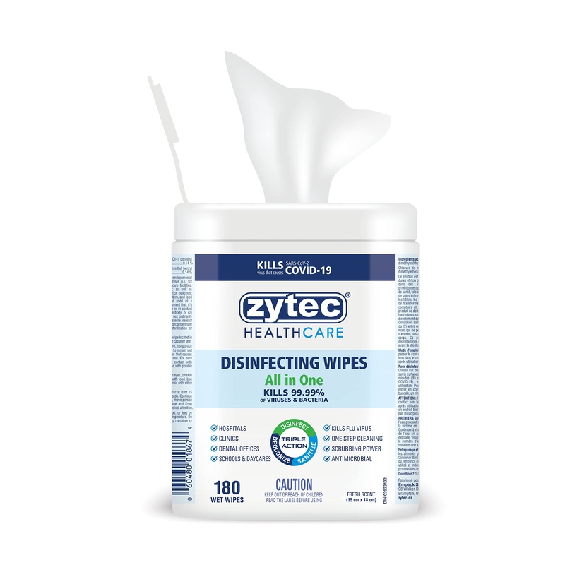 Zytec Germ Busters Healthcare All In One Disinfecting Wipes – 180 PkDisinfects hard, non-porous surfaces including tabletops, doorknobs, waiting area chairs. On Health Canada’s List of Hard-Surface Disinfectants with Evidence Against COVID-19 Proudly Made in Canada For complete directions, see the product label.For complete directions, see the product label. On Health Canada’s List of Hard-Surface Disinfectants with Evidence Against COVID-19. Disinfects hard, non-porous surfaces including tabletops, doorknobs, waiting area chairs.